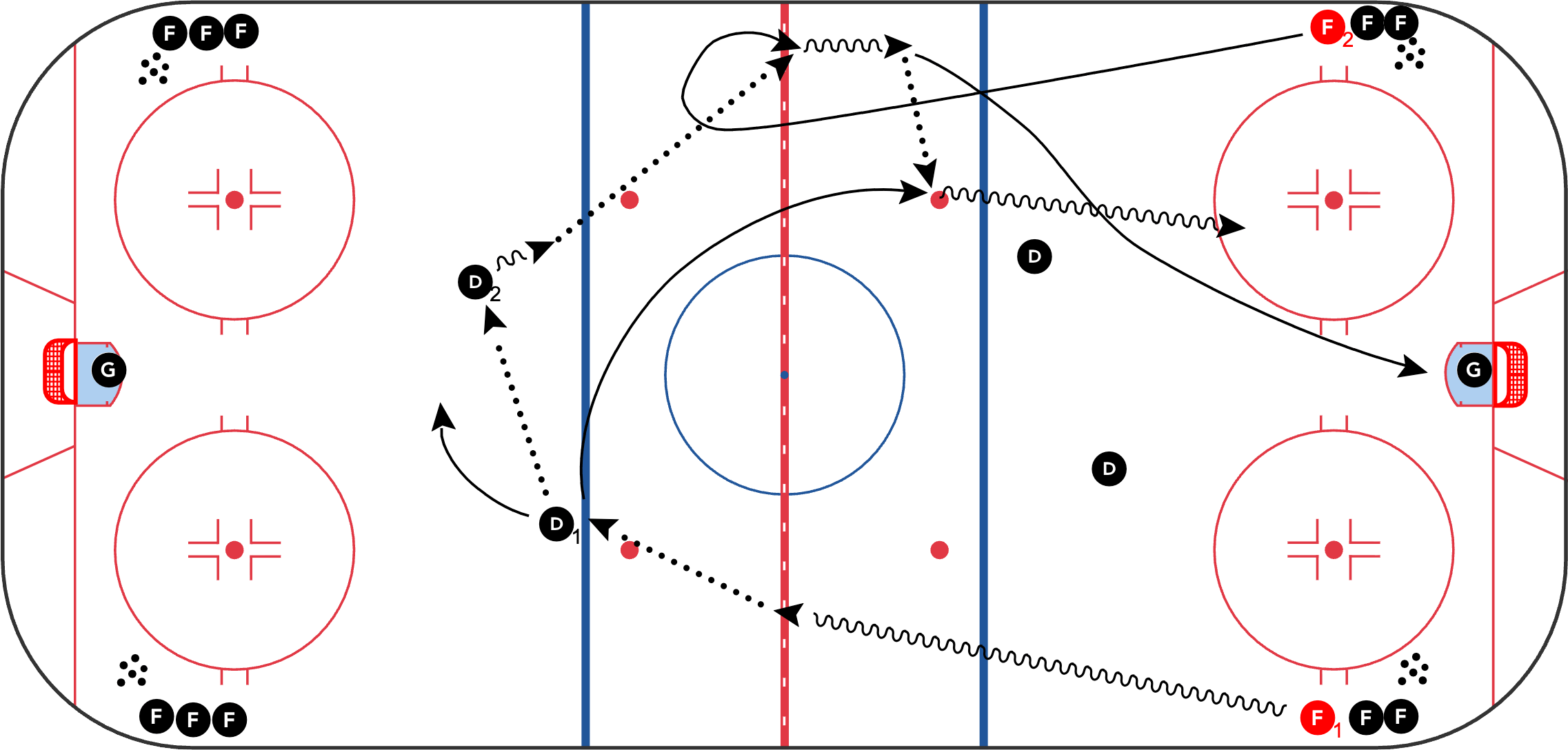 A. Five red set up in their NZFC. F1 gives a pass to D's and looks to get open in the NZ. Red tries to shut them down in NZ. Red needs to shut it down or get dump and get back past blue line.