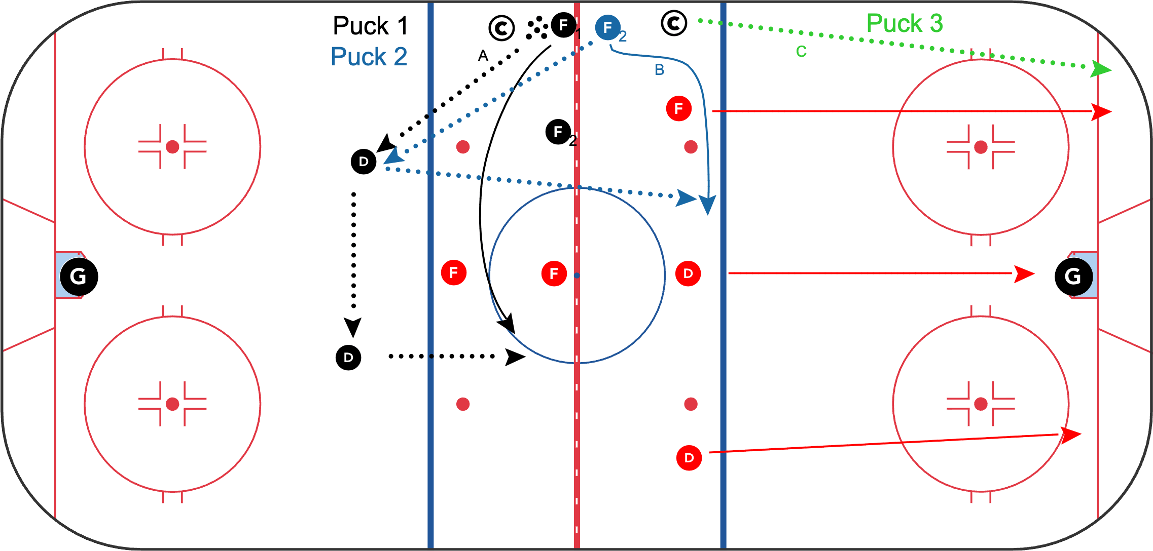 C. Coach dumps puck in. Five red BO vs the 2 black D's.