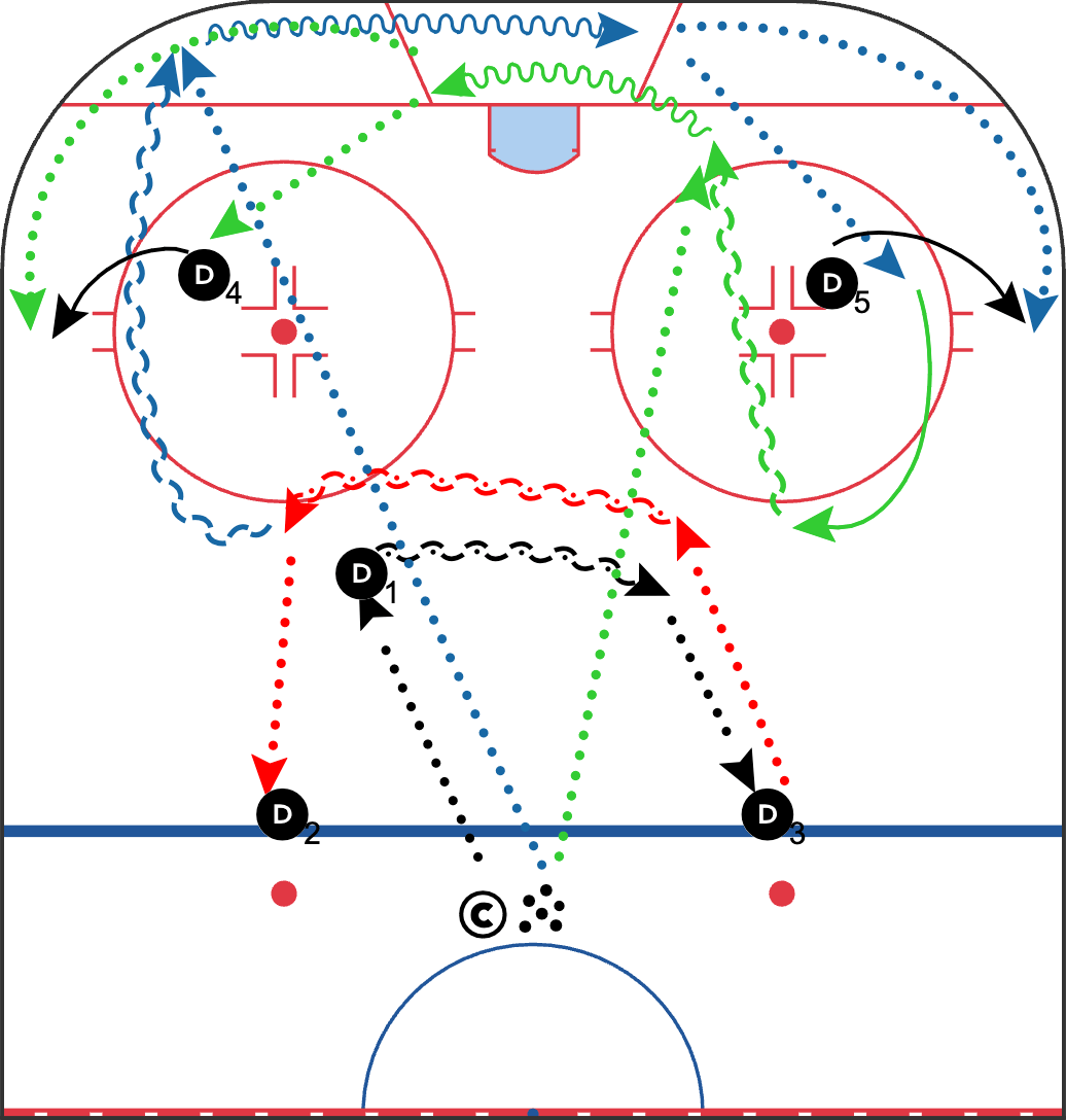 D1 gets up to D2 and receives pass, he then skates in a semi circle and passes to D3 (Red)